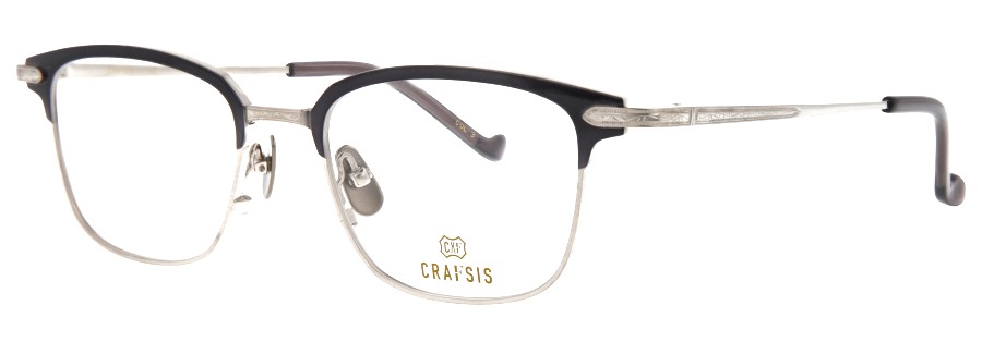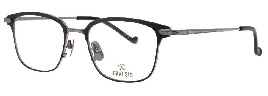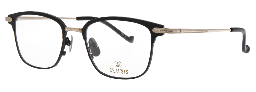 エッジの効いた立体的なメタルブローのウエリントンシェイプのフルリムモデル。ブローはフレーム本体とは異なるカラーを採用し、アクセントとしている。立体的なブリッジ、ヨロイからテンプルにかけて、ミル彫りと細かい彫金風の細工を施し、レトロな雰囲気に仕上げている。鼻あてには無垢の砂打ちした(マット)チタンパッドを採用し、風合いを感じさせるデザインに機能性もプラス。また、左テンプルエンドのみにブランドロゴを施している。
